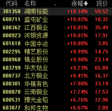 14:07 有色铜午后涨势扩大,江西铜业强势封板,股价创近15年新高;盛屯矿业、河钢资源、中国中冶等多股涨停。